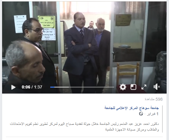 فى اطارات زيارات المتابعة والدعم التى يقوم بها مركز القياس والتقويم بوحدة إدارة مشروعات تطوير التعليم العالي _وزارة التعليم العالي والبحث العلمي – استقبل معالي رئيس جامعة سوهاج ا.د. احمد عزيز عبد المنعم خبراء المركز ا.د. اشرف بهجات و ا.د طه المستكاوى بالجامعة يوم الأربعاء والخميس ١٤ و١٥ فبراير ٢٠١٨ وذلك لزيارة مركز ووحدات القياس والتقويم بالجامعة لتحديد الوضع الراهن وقياس أدائه وفق أنشطته وبحث سبل الدعم الفنى الممكنه من أجل تطوير أدائه لتطوير نظم التقويم والاختبارات وفق أحدث النظم وزيادة رضا الفئات المستفيدة عن نظم التقويم والاختبارات بصفة خاصة بالمنظومة التعليمية بصفة عامة.